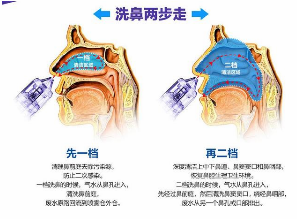 2.沖洗時不要說話或吞口水,不要用鼻子呼吸,不要捏著兩側(cè)鼻子擤鼻。